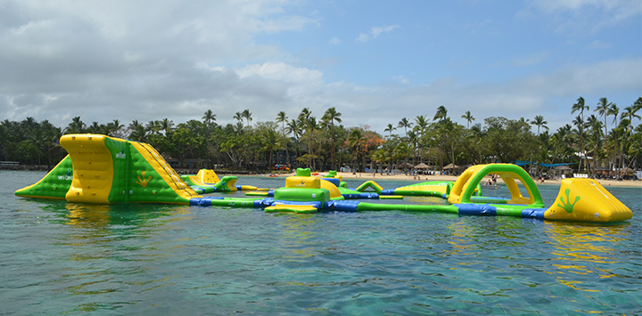 这是斐济珊瑚海岸唯一一座水上乐园。乐园面积25米见方,设施包括一架螺旋水上滑梯、单杠爬架、浮桥和游乐塔。
