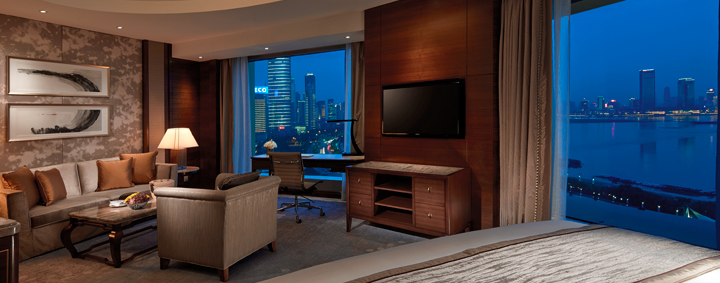 客室面積が45~149平方メートルのゲストルームとスイートを473室ご用意しております。お部屋は、磁器や伝統的な中国画の柄が入ったカーペットが使われ、涼しげなシルバーカラーやベージュがアクセントとなったモダンなインテリアで、フルサイズウィンドウからカン江の眺めがお楽しみいただけます。客室内エンターテイメントや無料のWi-Fi インターネット接続を無料でご利用いただけます。夜になると、秋水広場のアジア最大級の音楽噴水の眺めや毎日輝く水周辺の照明をご覧いただけます。