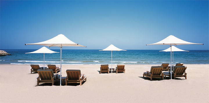 The deep turquoise blue water of the Sea of Oman is hypnotic, contrasting vividly with the majestic mountains that rise behind the resort. This is the fascination of Oman.